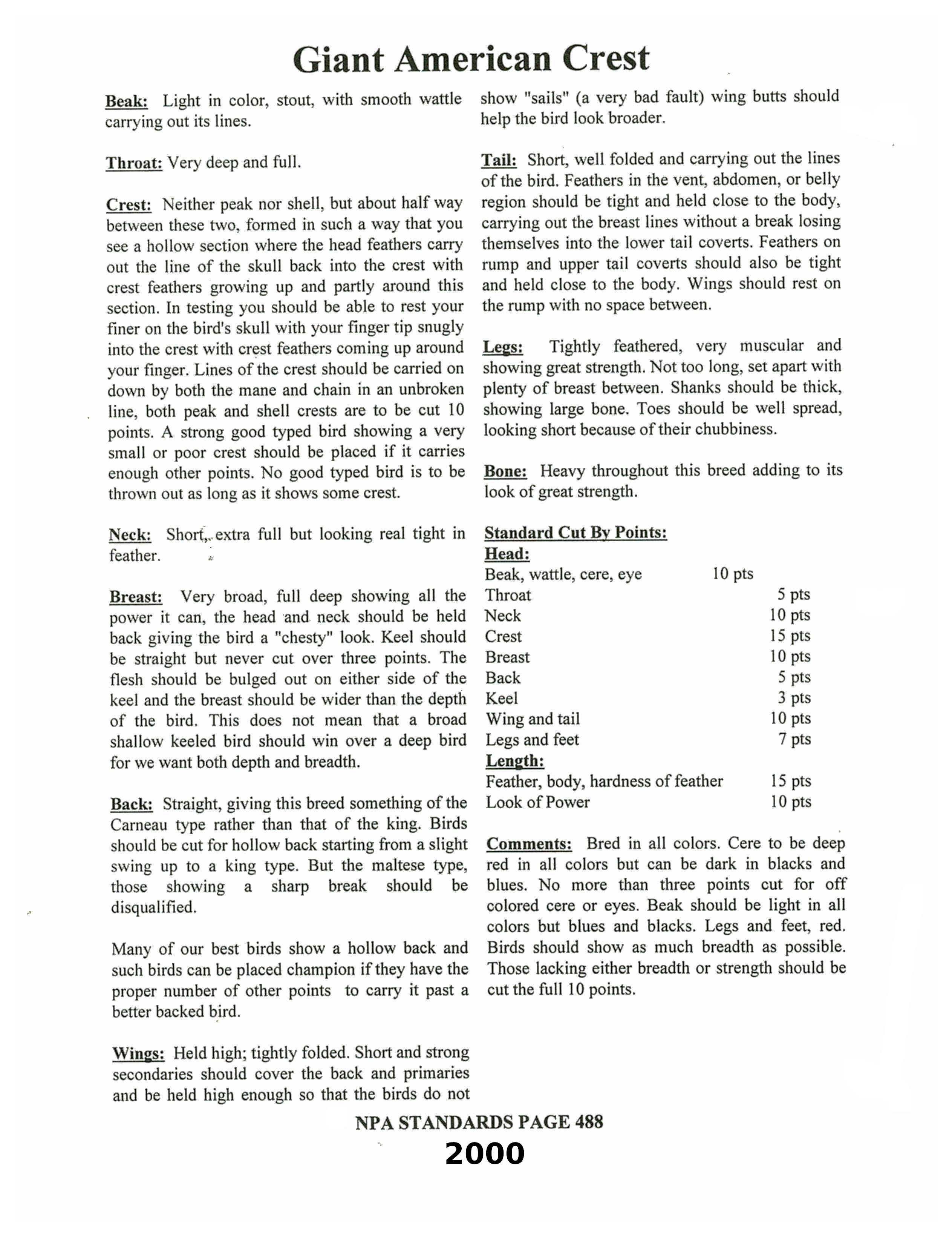 The National Pigeon Association recognized the Giant American Crest during the National Pigeon Association's convention in Philadelphia, in January 1940 adopting the name and standard of perfection concurrently. The standard has remained largely unchanged since that time. |