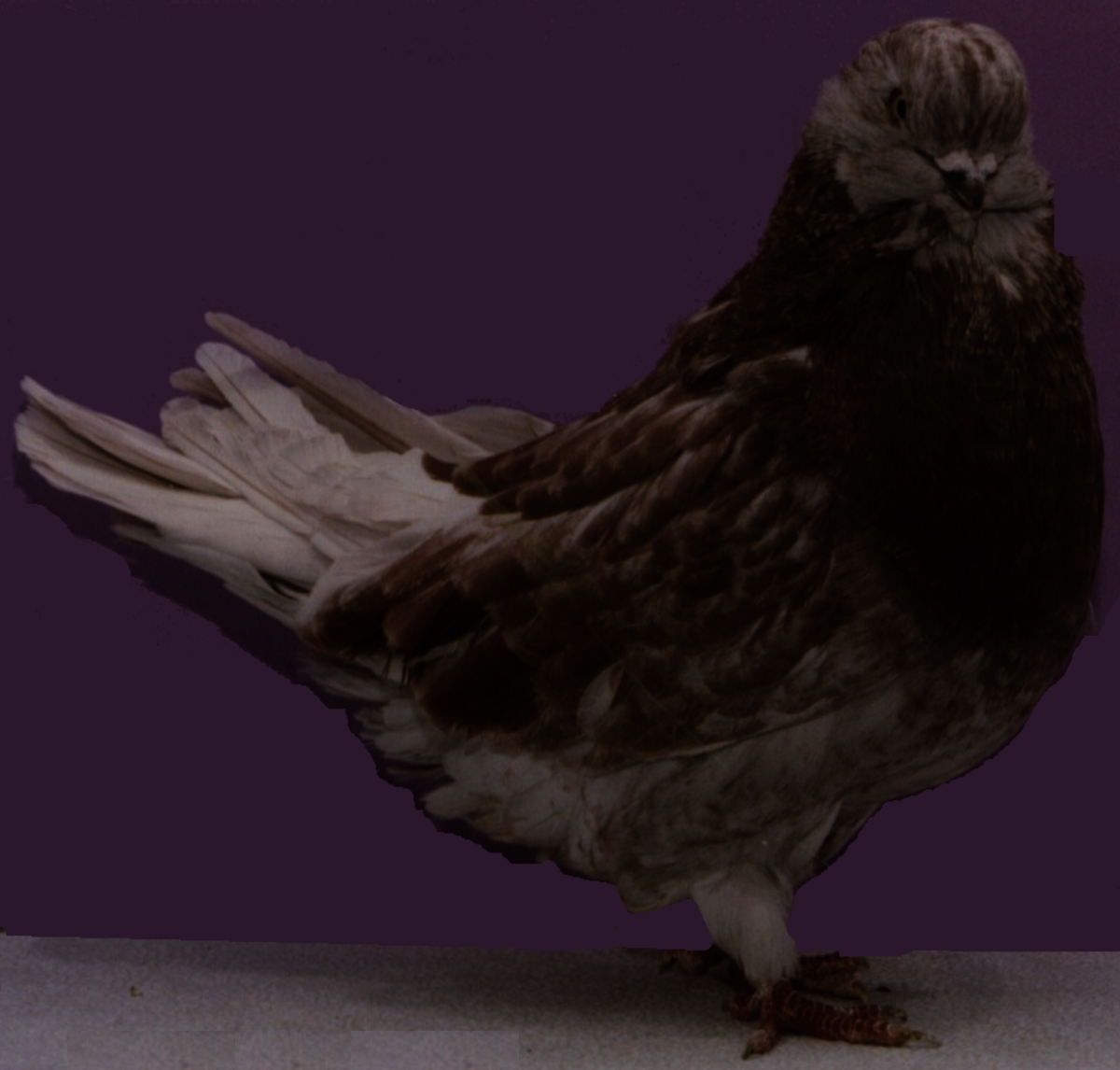This is a two handed bird! It is very broad at the shoulders, wide throughout, and tapering toward the tail. The head is large, even massive, fitting the body. The head is oval shaped rather than round. The wings are up off the floor, held close to the the body and do not protrude over the chest, appearing as a single line from neck to tail. Both the tail and wing feathers are held up, not dragging on the ground. The legs are short and thick, just as needed to hold up the two handed body. While large, the breed is gentle, even docile. They use the largest size bands made by the National Pigeon Association.